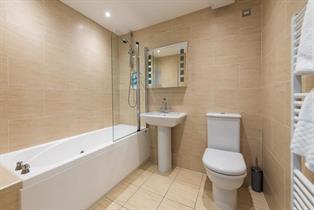 Luxury family bathroom with a bath, shower over, wash basin, WC and heated towel rail.