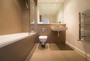 Family bathroom with bath, overhead rainfall shower, WC, basin and heated towel rail.