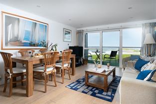 Superb open-plan living area with sofa-bed and views of Fistral Beach.