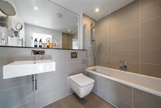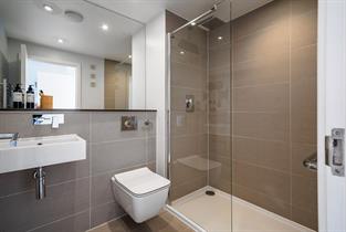 Family bathroom with overhead shower, wash basin, w.c. and heated towel rail.