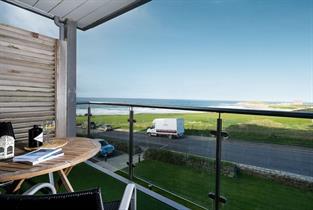 The apartment has a balcony overlooking Fistral beach with dining table and four chairs.