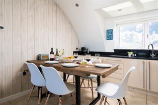 Dining room with a table and chairs seating six and a sea view to gaze out towards whilst you dine.