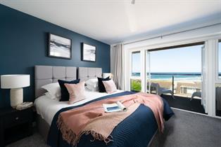Third bedroom on the first floor features a super king size zip and link bed, wardrobe, two bedside tables, Internet radio and bluetooth speaker system, with sea view.