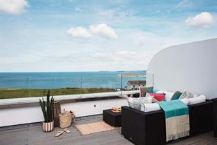 30 foot roof terrace with 270 degree Atlantic ocean views, featuring a rattan sofa and outdoor table seating six, perfect for dining as the sun sets over the headland.