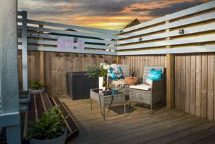 Positioned within just a short walk of its sandy stretch and just a short distance from the village’s pubs and restaurants, Wish You Were Here is a contemporary two-bedroom holiday home with an enclosed garden and hot tub, that offers families and couples a relaxing retreat in a fantastic seaside location. Open plan in design, its modern living area is airy and light; perfectly proportioned to include a dining space, lounge and kitchen, with double doors opening out to the patio and garden to allow the fresh sea air in. A lovely spot to soak up the Cornish sunshine or for relaxing with a post-beach drink, the outside space is furnished with a rattan suite and is completely enclosed so that guests who have their four-legged companions in tow can let them stretch their legs.
