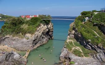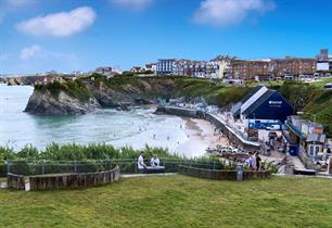 At high tide the beach gets almost entirely and people retreat to the Promenade with its shops and cafes or to the grassy slopes on the clifftops. The Island, joined to the cliff by a suspension bridge to the privately owned, House on the Island. Towan is a popular and often very busy beach, right in the centre of town. Good size of sand and rock, popular with both surfers and families. Use Town Centre parking which is a few minutes away from the beach, there are facilities including a café and public toilets.